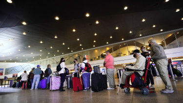 Passengers wait to check in for a Southwest Airlines flight at the Portland Jetport in Maine. Credit:AP