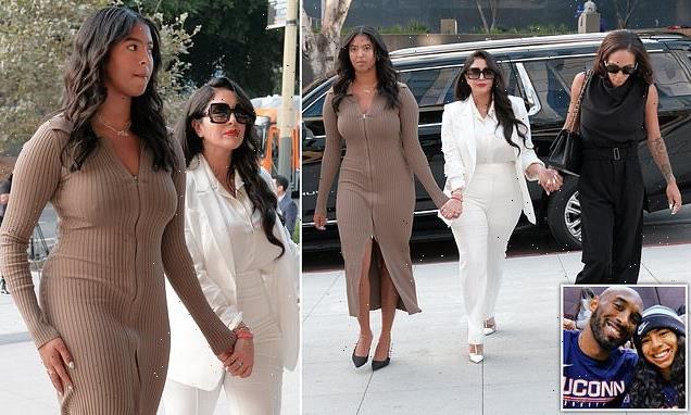 Vanessa Bryant, in white, is seen on Wednesday morning walking into court with her daughter Natalia, 19 (in brown dress) and family friend Sydney Leroux, a soccer player (far left)