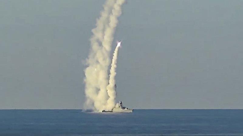 A long-range Kalibr cruise missiles launched by a Russian military ship from an unknown location on Friday.Credit:Russian Defense Ministry/AP