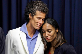 Bill Cosby accuser Andrea Constand, left, embraces prosecutor Kristen Feden during a news conference after Cosby was found guilty in his sexual assault retrial in 2018. Credit:AP