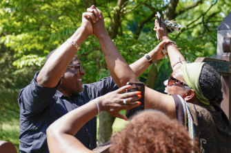 Bill Cosby spokesperson Andrew Wyatt celebrates with people gathered outside the home of the entertainer in Elkins Park, Pennsylvania.Credit:AP
