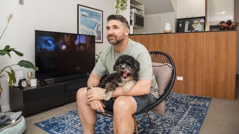 Michael Jermyn has an outdoor chair in his living room as he waits for the delivery of a sofa.Credit:Steven Siewert